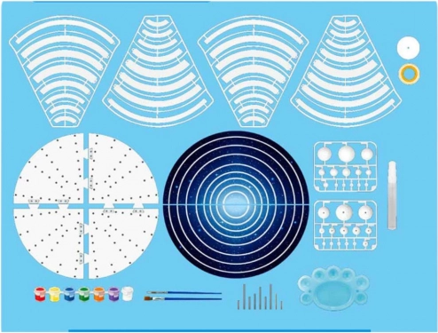 Questo set include modelli plastici dei pianeti, una tavola con orbite, componenti per il montaggio e un set di colori e pennelli. Il bambino può dipingere ciascun pianeta secondo il proprio design e poi posizionarlo nel punto corretto sulla mappa celeste. C'è anche un effetto fosforescente che rende il progetto finito eccezionale anche al buio.