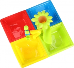 Costruzione sicura e durevole è fatta di materiali resistenti agli agenti atmosferici. Gambe stabili e bordi arrotondati garantiscono la sicurezza durante il gioco. Nella confezione è incluso anche un ricco set di utensili, come palette, rastrelli, annaffiatoio, secchiello e formine che offrono ai bambini infinite possibilità di gioco dinamico.