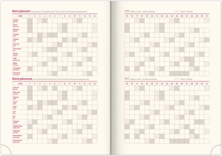 Elegante agenda settimanale per l'anno 2026 con un design unico e un calendario linguistico esteso, è la scelta ideale per la pianificazione quotidiana.