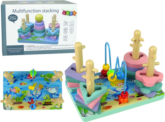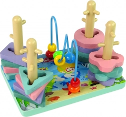 La base include un labirinto con 7 perline di diversi colori e forme che i bambini possono spostare lungo il percorso. Questo giocattolo sviluppa abilità come immaginazione spaziale, precisione e abilità manuali.