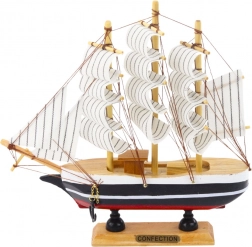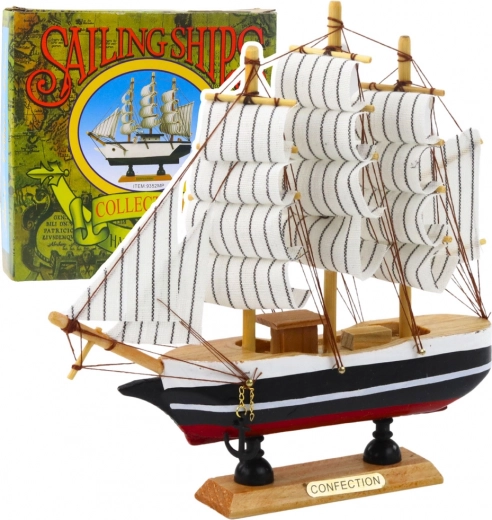 Questo modello compatto di veliero a tre alberi è una replica elegante di un'imbarcazione classica con un design contrastante nei colori nero, bianco e rosso. Le sue vele caratteristiche con sottili strisce e realistiche funi, insieme alla costruzione a tre alberi, lo rendono ideale per essere esposto.