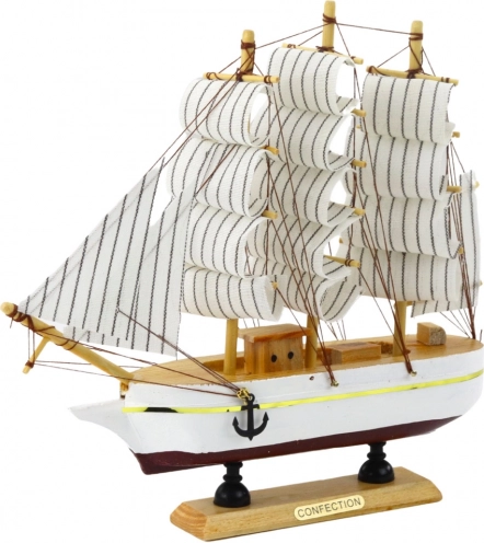 Questa replica è realizzata in legno e rifinita a mano, garantendo la sua autenticità e qualità. La combinazione della chiglia chiara e delle strisce nere sulle vele bianche crea un contrasto visivamente impressionante.