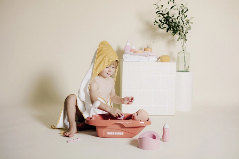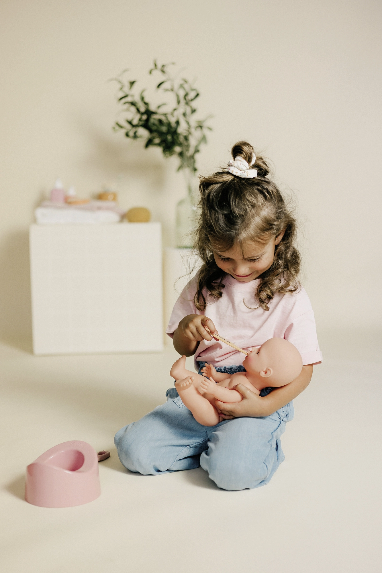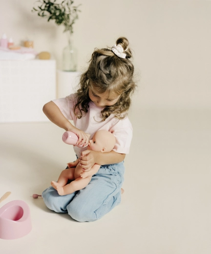 Il set comprende un’ampia gamma di accessori: vasino, termometro, spazzolino da denti, boccette e altri accessori facili da impugnare per i bambini. Il set è prodotto in Francia e utilizza materiali riciclati (76%), rendendolo una scelta ecologica. Adatto a bambole fino a 42 cm.