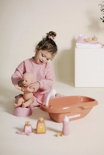 - vasca per bambole, doccetta manuale removibile (meccanica), biberon per il latte, spazzolino da denti, vasino, termometro, braccialetto, 2 boccette con accessori per la cura