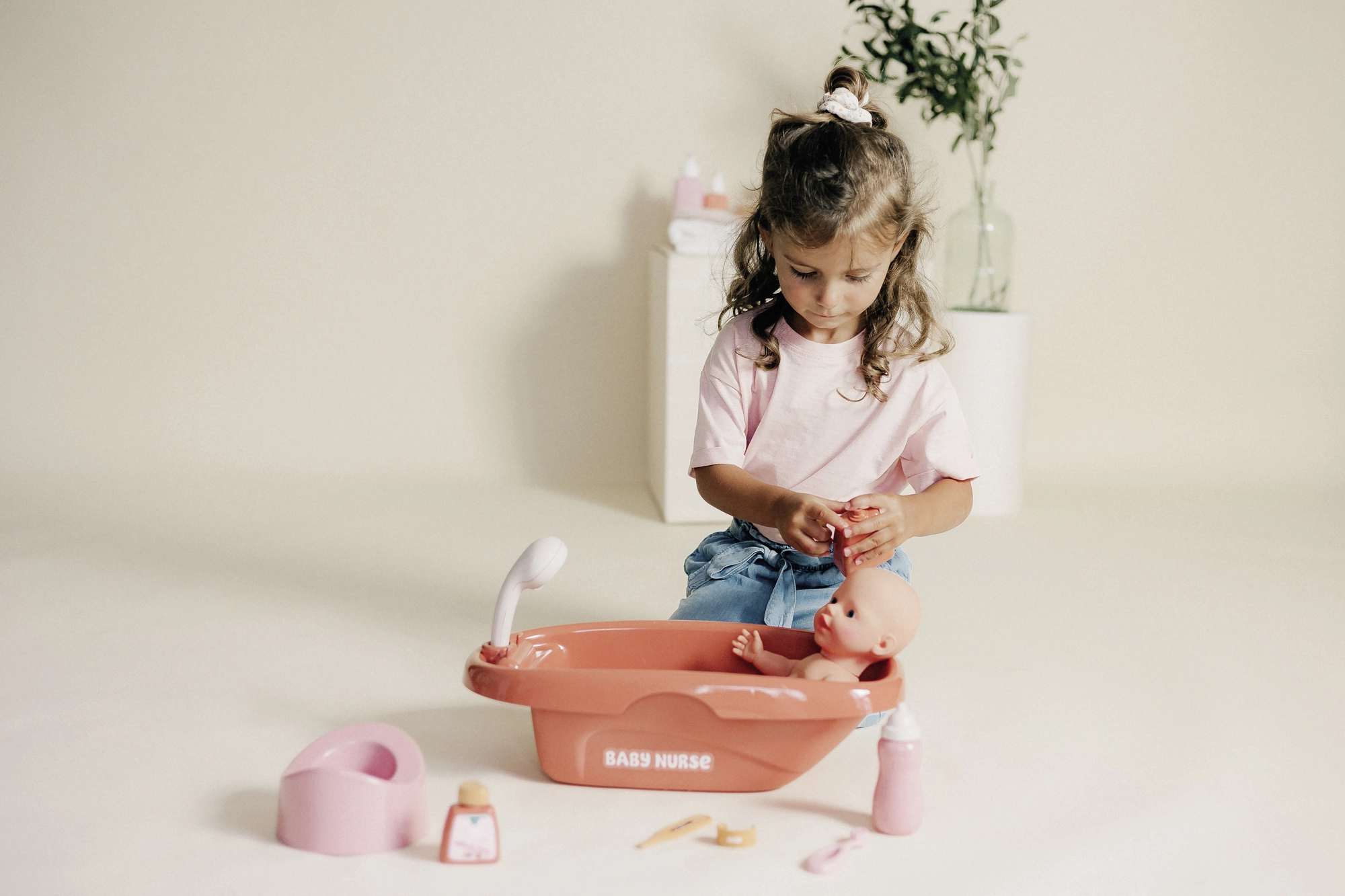La grande vaschetta con rubinetto e doccetta manuale removibile con rotazione meccanica permette ai bambini di imitare un vero bagnetto della bambola e stimolare la fantasia.