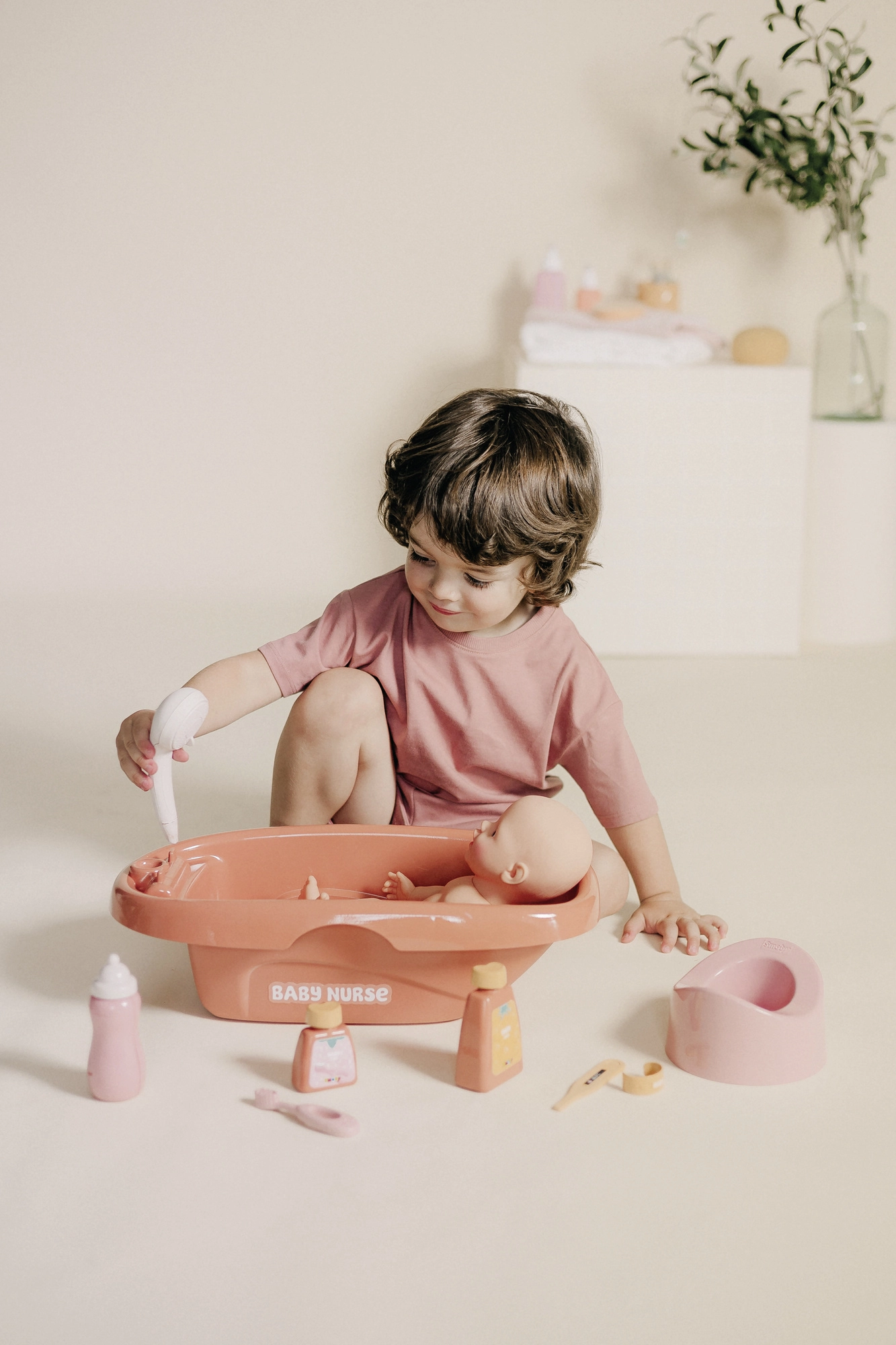 La vasca per bambole SMOBY BABY NURSE è un ottimo set per piccoli caregiver. Offre una vaschetta spaziosa con rubinetto integrato e doccetta manuale removibile con funzione di rotazione meccanica, rendendo il bagnetto della bambola molto realistico. Dopo il bagno i bambini possono nutrire la bambola con il biberon e occuparsi della sua igiene quotidiana.