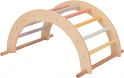 Il set pikler di 2Kids Toys include un triangolo, una tavola e un arco, che insieme offrono un'ampia gamma di applicazioni per le attività motorie dei bambini. Il triangolo e l'arco fungono da arrampicata, mentre l'arco, con una semplice rotazione, si trasforma in un'altalena divertente. La tavola può funzionare come passaggio tra i due elementi o, grazie alle prese installate, come prima parete da arrampicata per l'allenamento.