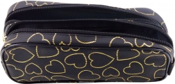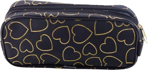 Realizzato in materiale tessile resistente con una leggera lucentezza, l'astuccio si distingue per la stampa di cuori dorati su sfondo intensamente nero. Le cerniere robuste garantiscono la conservazione sicura dei contenuti. La sua struttura morbida e flessibile consente una facile collocazione nello zaino o nella borsa senza occupare spazio inutile.