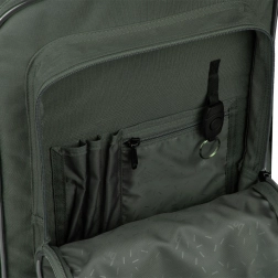 - Il comparto anteriore contiene un pratico organizer e un moschettone staccabile per le chiavi.