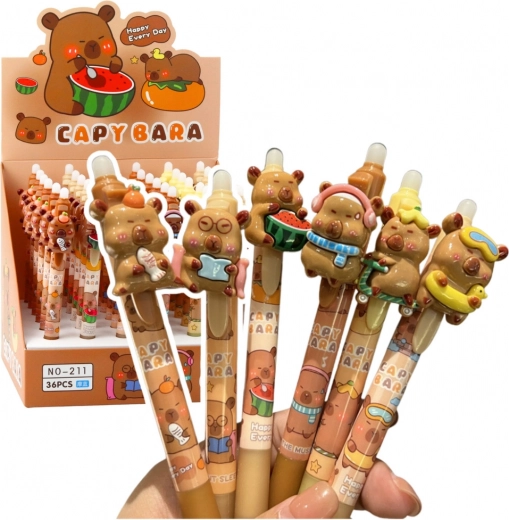 La penna automatica con tema capibara offre non solo funzionalità, ma anche un design divertente che sarà apprezzato da tutti gli ammiratori di questi animali. Sulla cima della penna c'è una figura decorativa 3D realizzata in gomma morbida, che può essere facilmente premuta, creando un elemento giocoso.
