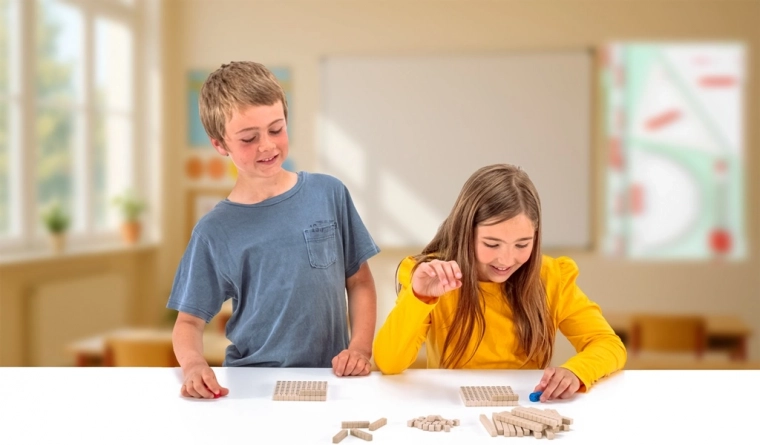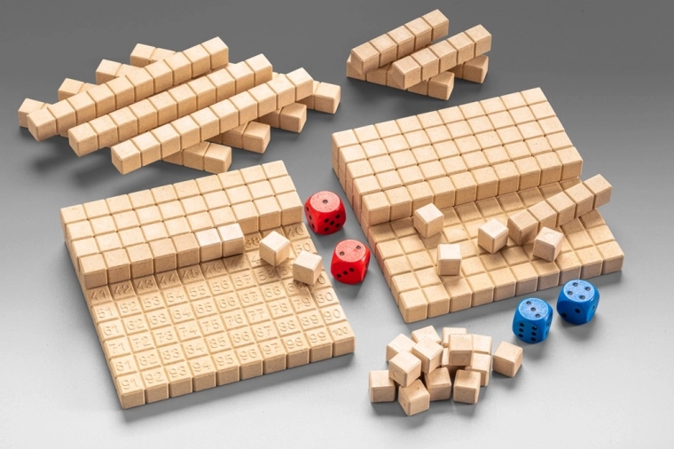 Il contenuto della confezione include: due tavole con numeri, 22 bastoncini da dieci, 6 bastoncini da cinque, 28 cubetti unitari, dadi rossi e blu e istruzioni in più lingue. Il gioco è adatto per il lavoro individuale e di gruppo.