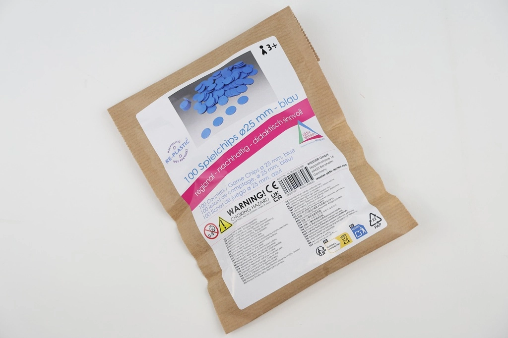 I gettoni sono prodotti in Germania e confezionati in un sacchetto di carta richiudibile con certificazione FSC, garantendo un approccio responsabile verso la natura. Con un diametro di 2,5 cm, sono facilmente maneggevoli anche per i bambini piccoli.