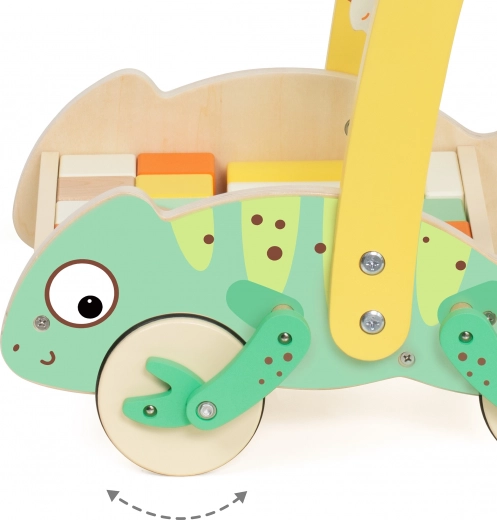 Il girello in legno del marchio Classic World è dotato di gambe del camaleonte che si muovono con le ruote, aumentando il divertimento durante la spinta. Include anche blocchi di forme e colori diversi, che consentono una costruzione libera e lo sviluppo della creatività e delle abilità pratiche. Un labirinto con perline sulla maniglia aggiunge un'opzione di divertimento interattivo, sostenendo la coordinazione occhio-mano e destrezza.