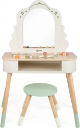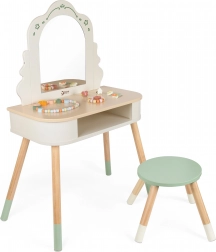 Toeletta in legno di Classic World è progettata appositamente per le bambine che sognano il proprio angolo di gioco per truccarsi e vestirsi. Include uno sgabello rotondo, uno specchio e vari accessori che aiutano a sviluppare la loro immaginazione e destrezza manuale.