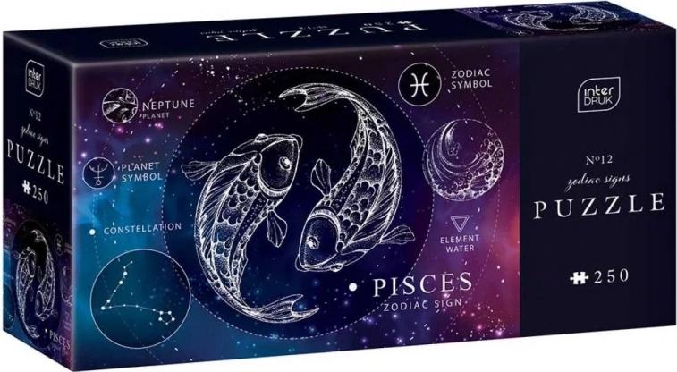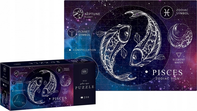 Scopri la magia dello Zodiaco con questo meraviglioso puzzle Pesci del marchio Interdruk. Il puzzle contiene in totale 250 pezzi, che creano un'immagine di dimensioni 48 x 33 cm.