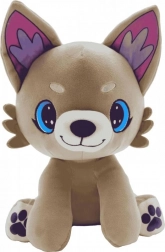 Giocattolo di peluche marrone con occhi viola e un viso sorridente. Ideale per giocare e coccolare per i bambini.