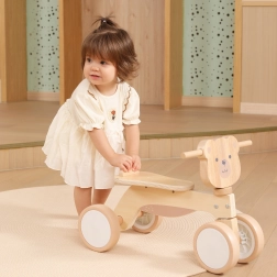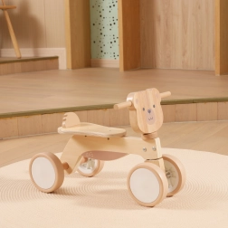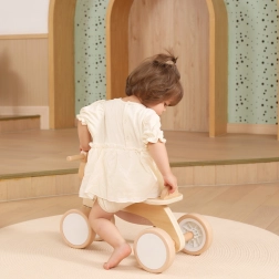 I primi passi nel mondo della guida saranno più sicuri grazie alla struttura a quattro ruote stabile e alla sella confortevole con schienalino antiscivolo. La balance bike è realizzata in legno di qualità e monta ruote in EVA silenziose, delicate sul pavimento e adatte anche a superfici esterne lisce.