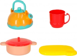 • Accessori da cucina (15 pz): teierina, pentola con coperchio, posate (coltello grande e piccolo, cucchiaino, forchetta), tazza, tagliere, piastrina/cucinina per bambini, cestino.