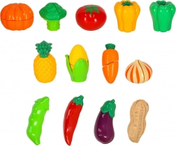 • Frutta e verdura con velcro (13 pz): piselli nel baccello, peperone verde, peperone giallo, peperoncino, cipolla, broccoli, mais, pomodoro, ananas, zucca, melanzana, fagioli, carota.