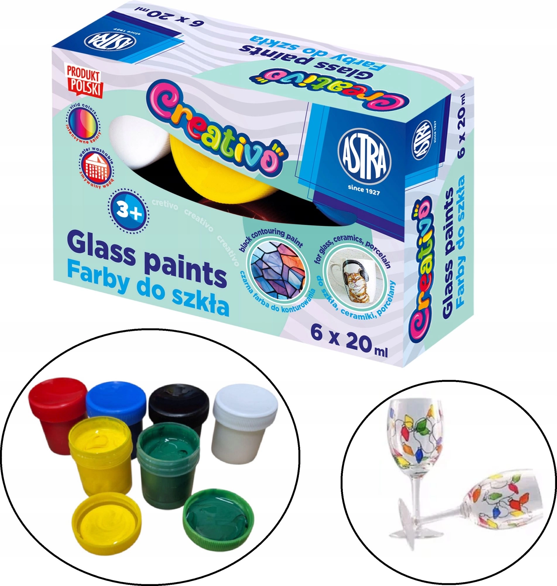 Colori per vetro semitrasparenti ASTRA CREATIVO in set da 6×20 ml, ideali per creazioni creative e decorazioni originali. Adatti per vetro, ceramica e porcellana, sono facili da usare e offrono risultati splendidi – perfetti per progetti fai-da-te, regali e attività artistiche con i bambini.