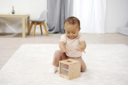 L’intero set è realizzato in 100% legno di faggio certificato FSC, noto per la sua resistenza e l’aspetto naturale piacevole. Il design studiato con oblò mantiene l’attenzione e motiva a ripetere l’attività. Il gioco favorisce lo sviluppo della motricità fine, la coordinazione occhio–mano e il pensiero logico.