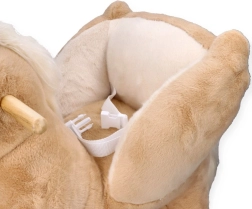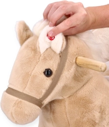 L’alimentazione è fornita da due batterie AA, riposte in sicurezza in una taschina sotto il pancino del cavallo. Il giocattolo rispetta gli standard CE e offre una struttura stabile, un sedile confortevole e divertimento per molte ore.