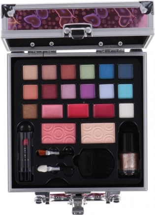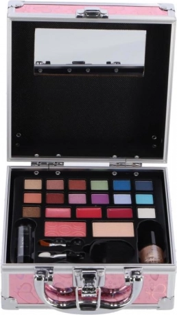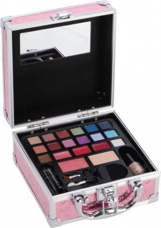 All’interno troverai una ricca selezione di ombretti, delicati fard, lucidalabbra e rossetto; non mancano lo smalto e pratici applicatori. La struttura robusta, gli angoli in metallo e la chiusura sicura mantengono tutto protetto, mentre i vani organizzati assicurano ordine.