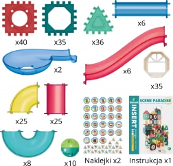 • Elementi vari della pista: canaline, curve, tubi e altri moduli per un fluido movimento delle biglie.