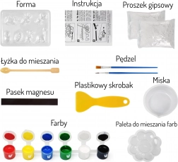 - Tutto nella confezione: stampi, gesso, ciotola, cucchiaino, tavolozza, 6 colori, pennello, spatola, istruzioni