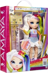 Amaya Raine della serie Rainbow High Jr. High porta ai bambini il mondo della moda e della musica in un’unica dolce bambola. Grazie ai lunghi capelli arcobaleno, all’outfit curato e alle articolazioni, è pronta per concerti, servizi fotografici e per essere esposta sullo scaffale. Gli accessori, tra cui la mini tastiera, sostengono il gioco da star della musica.