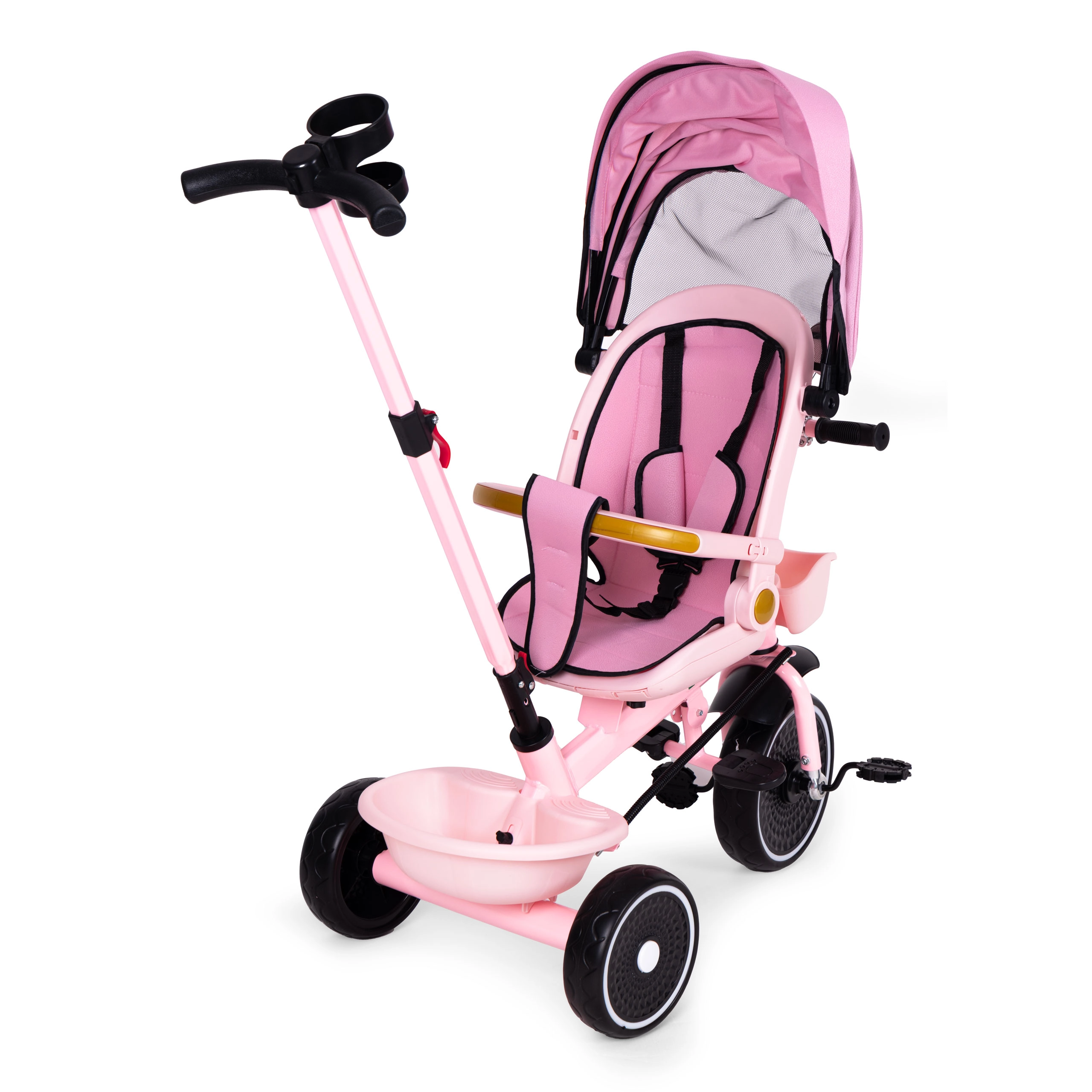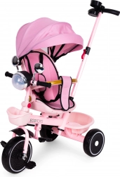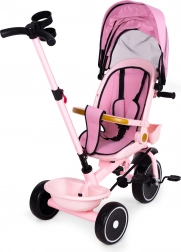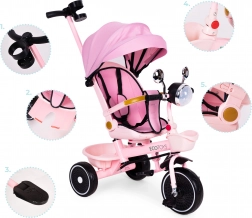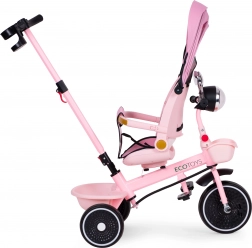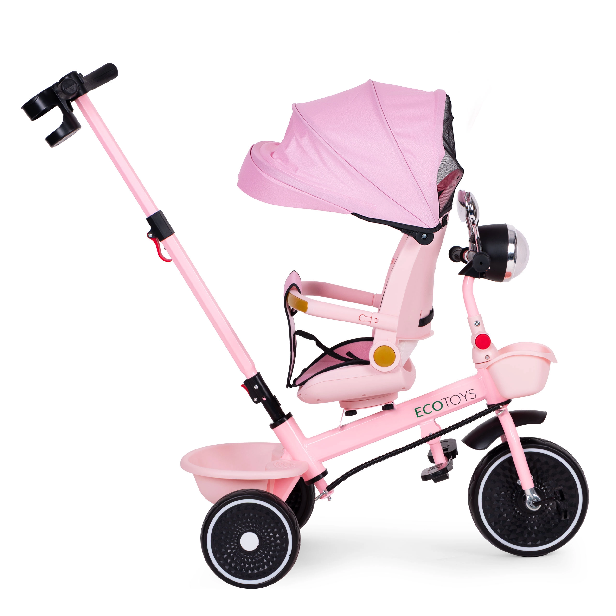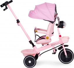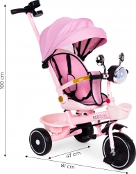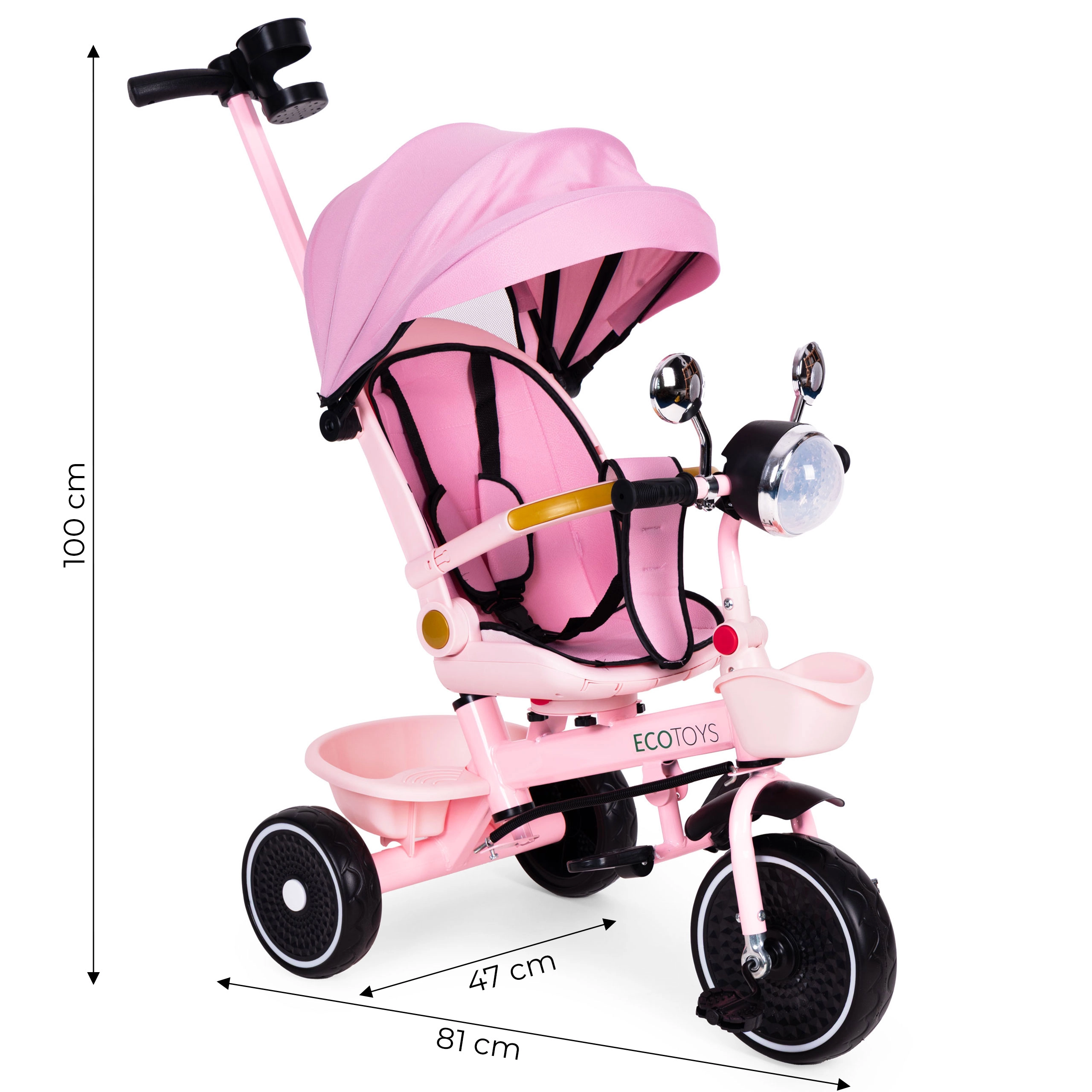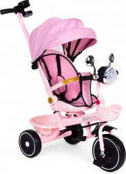 L'elegante triciclo rosa ECOTOYS combina il comfort di un passeggino con il divertimento di un triciclo. Offre un sedile girevole a 360°, una asta di guida per i genitori con controllo della ruota anteriore, una capottina pieghevole, una cintura di sicurezza a 5 punti e ruote in EVA resistenti per una guida fluida e sicura dai 6 mesi ai 6 anni.