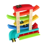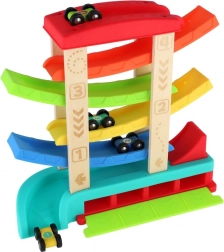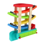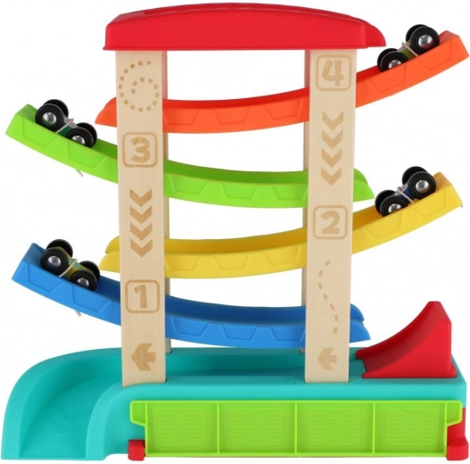 Questa pista da corsa a cascata combina montanti in legno robusto e rampe in plastica resistente dai colori vivaci che stimolano la curiosità e la percezione visiva dei bambini. I piccoli sviluppano la motricità fine, la coordinazione occhio–mano e la comprensione del rapporto causa–effetto osservando il percorso delle macchinine.