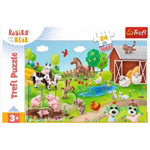 Puzzle per bambini Trefl BOBASKI E ANIMALI: 24 pezzi maxi, dimensione 60×40 cm, carta calandrata lucida, produzione ecologica in Polonia. Adatto dai 3 anni.