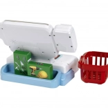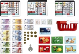 Il set include cestino della spesa, banconote e monete, carta di pagamento e schede prodotto, così i bambini possono scansionare gli articoli, registrarli alla cassa e “pagare” sia in contanti che con carta. Le tre schermate intercambiabili trasformano la postazione a seconda dell’umore: negozio, bistrot o cassa classica.