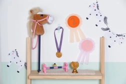 Scopri il divertimento dell’hobby horsing per le tue bambole BABY born! Questo set include un cavallino su bastone con testa morbida in peluche, fantastici accessori per allenamento e gare e una motivazione extra sotto forma di medaglia e coppa del vincitore. Ideale per bambole di 36 cm e 43 cm e perfetto per sviluppare fantasia e gioco attivo.