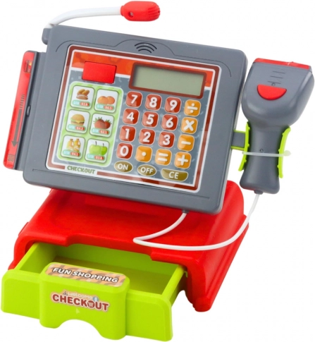 Cassa giocattolo con luci e suoni, scanner, microfono e cestino. Insegna a contare e sviluppa la comunicazione. Plastica di qualità, versione rossa.