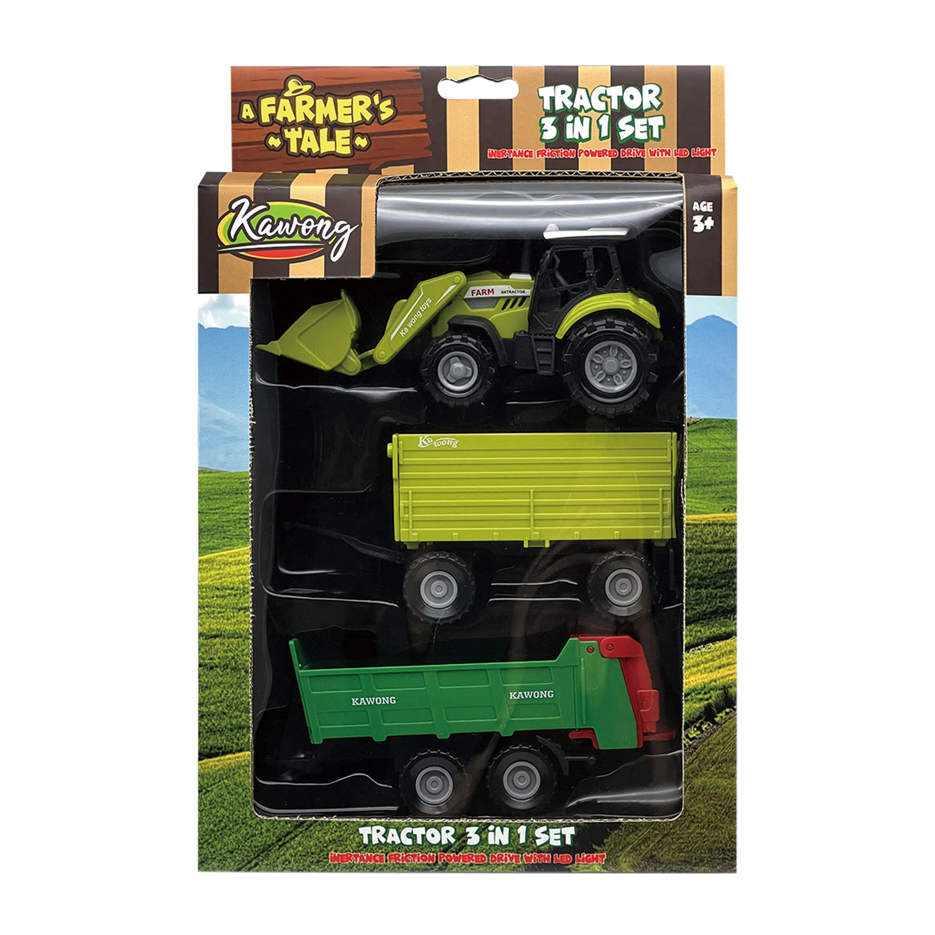 Preparati al divertimento in fattoria! Questo trattore per bambini con due rimorchi staccabili offre effetti luminosi e sonori, movimento a spinta per un facile controllo e tantissime possibilità di gioco. Le batterie AG13 sono incluse nella confezione, quindi il divertimento può iniziare subito.