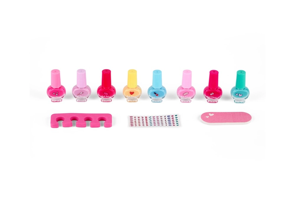 Il contenuto del set include accessori pratici per la preparazione delle unghie (lime, spazzolino), nonché strumenti per applicazioni creative (pennelli di varie misure, applicatori). Grazie alle decorazioni multicolore, abbinerai facilmente il look all’outfit o alla stagione, donando alle unghie un effetto luminoso.