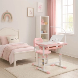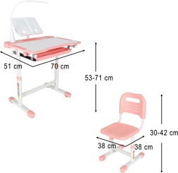 La scrivania ergonomica regolabile con sedia offre ai bambini dai 3 anni in su un ambiente ideale per studiare, scrivere e creare. L’altezza del tavolo (53–71 cm) e della sedia (30–42 cm) si adatta facilmente all’età e alla statura del bambino. Il piano inclinabile fino a 55° favorisce una postura corretta e facilita lettura, disegno e scrittura.