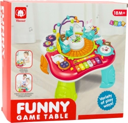 Il tavolino può essere usato come classico tavolino in piedi oppure come pannello educativo piatto: grazie alle gambe rimovibili si adatta facilmente all’età del bambino e allo spazio. Il centro del divertimento è il coniglietto mobile, che stimola l’attenzione e la coordinazione occhio–mano, mentre il pianolino e il tamburello arricchiscono il gioco con allegre melodie e suoni.