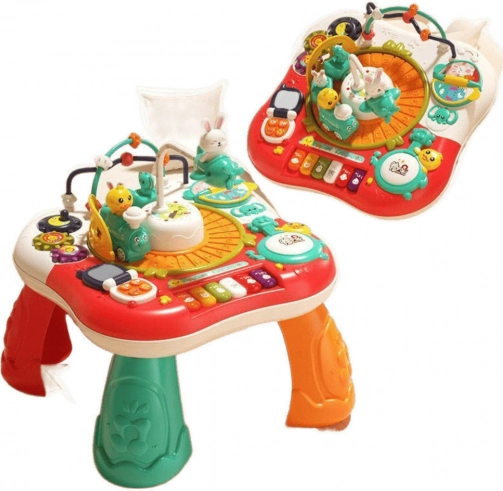Il tavolino educativo interattivo 2 in 1 è un giocattolo versatile che unisce apprendimento e divertimento. Offre un pianolino, effetti luminosi e sonori, un telefono, un tamburello, rotelle girevoli, ingranaggi e un coniglietto mobile, grazie ai quali i bambini scoprono colori, forme e suoni e sviluppano motricità fine e percezione sensoriale.