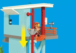 Questo set dettagliato include una torre di salvataggio a due piani con scivolata sul palo, una postazione del bagnino completamente equipaggiata e un angolo officina con attrezzi al piano inferiore. Non manca il buggy da spiaggia per interventi lontano dalla torre, la tavola di salvataggio e il fedele cane da salvataggio con pettorina.