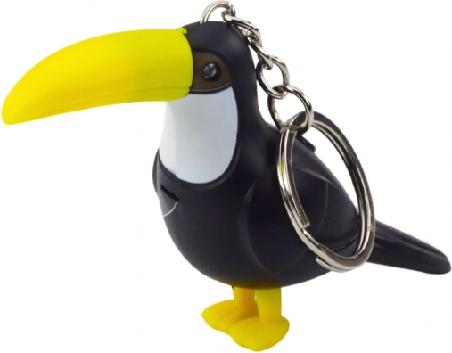 Portachiavi a forma di tucano con torcia LED e suono. Accessorio resistente, divertente e pratico per chiavi o zaino. Ottima idea per un piccolo regalo.