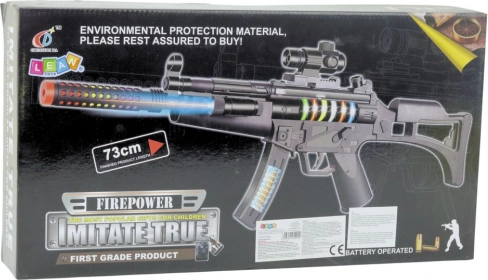 Questo fucile per bambini è realizzato in plastica di alta qualità e resistente, adatta a un gioco intenso e sicura per i più piccoli. La lunghezza impressionante di 73 cm esalta l’aspetto realistico e dona ai bambini la sensazione di vera azione. Premendo il grilletto si attivano effetti luminosi e sonori, che rendono il gioco ancora più coinvolgente.