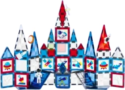 Costruisci razzi, veicoli, alte torri e fantastiche strutture 3D ispirate al cosmo. I pezzi magnetici con stampe di astronauti, razzi e pianeti incoraggiano i bambini al gioco creativo e alla narrazione. Gli elementi trasparenti e multicolore brillano alla luce e, grazie ai magneti potenti, mantengono le forme stabili.