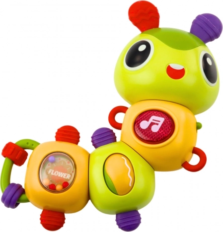 Bruco sensoriale interattivo – sonaglio musicale e mordicchiatore con elementi rotanti a 360°