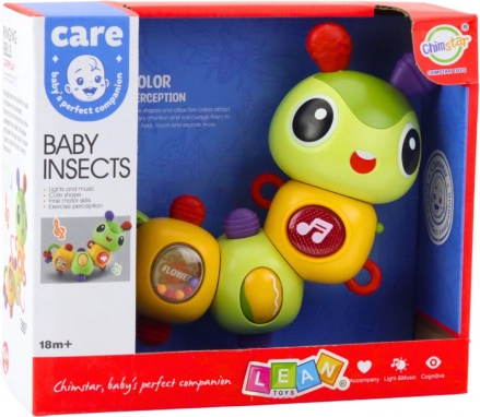 Bruco sensoriale interattivo per bambini dai 18 mesi: luci LED, melodie, elementi rotanti a 360°, perline, sonaglio e mordicchiatore. Sostiene sensi e motricità.