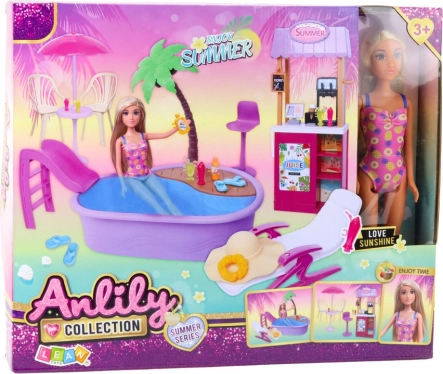Goditi il divertimento estivo con la bambola ANLILY in vivaci costumi da bagno e un ricco set di accessori. Il set include piscina con palma e scivolo, lettino, ombrellone con tavolino e seggiolina e chiosco delle bevande per giochi creativi sulla “spiaggia tropicale”. Perfetto per lo sviluppo della fantasia, della motricità fine e del gioco di ruolo.