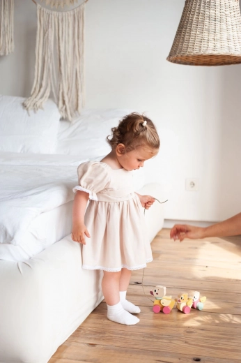 Il giocattolo è progettato per sviluppare in modo naturale le abilità dei bambini e portare gioia ogni giorno. Con una cordicella lunga circa 60 cm, è comodo da trainare anche per i più piccoli.