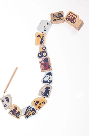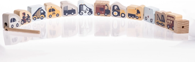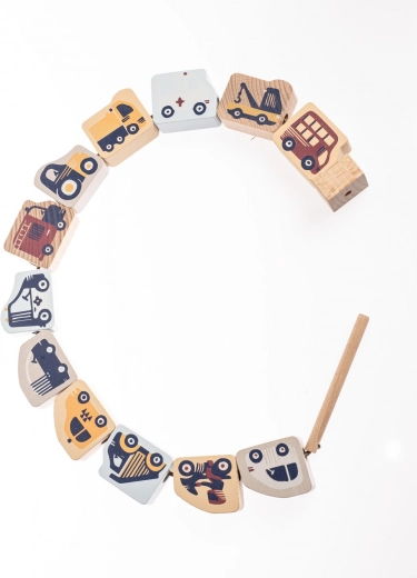 - Contenuto del set: elementi in legno con motivi di trasporto, laccetto con ago e fermo, schede modello